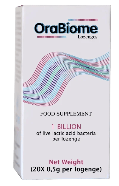 Orabiome is a food supplement containing Levilactobacillus brevis* DSM27961 for oral hygiene. It is available as a lozenge that quickly dissolves in the mouth and helps improve oral health.